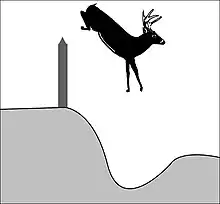 A salter consists of a short ditch, with one side higher than the other. The high side is topped by a picket-style fence or palisade, while the low side is planted to attract deer. Natural features were sometimes used, such as rock walls or ledges from which deer leapt, but were unable to leap back.[3]