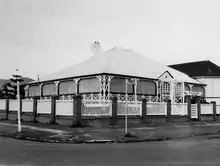 The southern section has two parallel hipped sections, with a flat roofed section between, surrounded by a recent verandah with a curved corrugated iron awning and timber details to match the earlier section.[1]