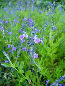 Salvia coahuilensis is a perennial shrub native to the Sierra Madre Oriental in the Mexican state of Coahuila. It is a low-growing evergreen, under 2.5 ft in height and width, with many woody branches growing from the base. It has 1 in long beet-purple flowers, and 1 in long widely spaced, linear olive-green leaves.[1]