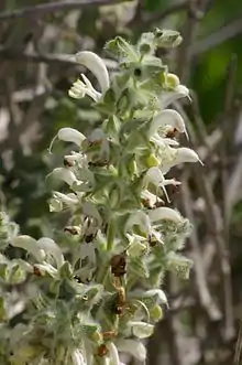 Salvia dominica (Dominica sage, in Arabic ( Maru = مرو or "Khowwekha" = خويخة ), in (Hebrew: מרווה, marva) is a strong-scented perennial shrub found throughout the eastern Mediterranean, especially Jordan[1] Israel,[2] Lebanon and Syria. The branched inflorescence is one of several salvias thought to have inspired the design of the menorah. It grows to about 1 meter in height and width, and blooms in spring or early summer with pale yellow and white flowers in delicate whorls.[3]