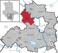 Salzatal is a municipality in the Saalekreis district, Saxony-Anhalt, Germany. It was formed on 1 January 2010 by the merger of the former municipalities Beesenstedt, Bennstedt, Fienstedt, Höhnstedt, Kloschwitz, Lieskau, Salzmünde, Schochwitz and Zappendorf.[3]
