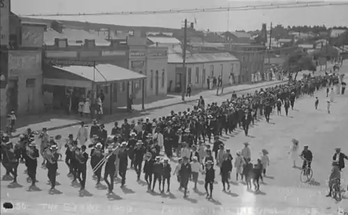 Byrne was witness to several industrial disputes between Broken Hill's mine labourers and mining companies. As a nine-year old child he recalls the 1892 strike, triggered by proposed wage reductions as a result of low metal prices. To replace the striking workers, the mining companies imported contract labour "scabs" from South Australia and Victoria. This led to the workers losing the strike and accepting a wage reduction.[16] Byrne and his childhood friends used to throw rocks on the houses of the scabs, and trip up mine officials who were delivering anti-union newspapers.[21] He witnessed the striking miners, which included his foster uncle, capturing the scabs and subjecting them to a ritual of public humiliation, whereby they were covered in hot tar and feathers.[22][8]