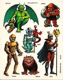 One of these was The Land of Ta, a short-lived series of fantasy stickers produced by Dennison in 1981 to 1982. The first two sticker sheets titled The Land of Ta (1981) were illustrated and painted by Sam Petrucci, who was not credited. Sheet #80-218 featured original characters named Zoltan, Harry, Iggy, Tokar, Geedis, and Erik. Sheet #80-219 featured six more original characters: Hermann, Eris, Uno, Shimra, Radon, and Stefan. An unknown artist illustrated the third sticker sheet (#80-224) titled Women of Ta (1982); it featured female characters named Cecily, Astrid, Sybil, Amneris, Ursula, and Rimelda.[4]