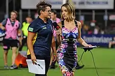 Lane (right) interviewing Bec Goddard during the round 6, 2017 AFLW match between Adelaide and Melbourne.