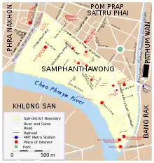 Samphanthawong (Thai: สัมพันธวงศ์, pronounced [sǎm.pʰān.tʰā.wōŋ]); Chinese: 三攀他旺县) is one of the 50 districts (khet) of Bangkok, Thailand. Regarded as Bangkok's Chinatown, it is the smallest district in area but has the highest population density of Bangkok's districts. Neighboring districts are (from north clockwise) Pom Prap Sattru Phai, Bang Rak, Khlong San (across Chao Phraya River), and Phra Nakhon.