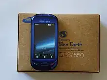 Samsung Blue Earth, also known as Samsung S7550, or Samsung GT-S7550 (European model) is a touchscreen phone made from recycled plastic culled from plastic water bottles.[2] It was announced on 13 February 2009. The unit has a solar panel on the back, covering 80% of the area. An hour of charging under sunlight can provide 10 minutes of talking on 3G networks or 2 hours in standby.[3] A conventional rechargeable battery is also provided.