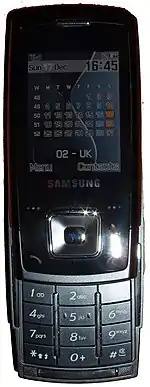 The Samsung E900, introduced in 2006, is a high-end mobile phone and is derived from Samsung's D500-D600-D800 series of slide phones. It is of a slide-up design and has touch-sensitive keys, similar to the LG Chocolate (KG800). It was one of the most popular phones at the time but was discontinued late 2007 when buyers then turned their attention to the Samsung D900i, followed by the Samsung U600, which was the slimmest phone by Samsung with a thickness of 1.09 cm (0.43 in) until the E840 was released.