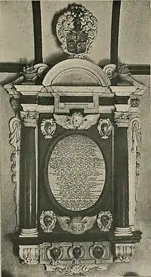 Samuel and Elisabeth Backhouse had eight children, four sons and four daughters (one of whom predeceased him).[2] The sons were born John (b. 1584), Nicholas, Samuel, and William (b. 1593).[13] In the autumn of 1607, a visitor to Swallowfield reported Backhouse proposed a marriage between one of his sons and one of Henry Neville's daughters. This offer reportedly fell through, leaving Backhouse "not a little perplexed", though the rebuffed proposal apparently led to no enduring antipathy between the families, as Backhouse was made godfather to Neville's child the following year.[2] In 1618, Backhouse and his family became involved in a quarrel over the ownership of some pews in Swallowfield church, which was ultimately brought in front of the Star Chamber.[2] In the course of this dispute, Backhouse's son John attacked one John Phippes with a spear.[14]
