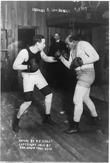 In 1909 Berger faced heavyweight champion Jim Jeffries in at least five exhibitions in Pennsylvania and New York, and had two exhibition with him in California in 1910. At the time, Jeffries was one of highest paid vaudeville attractions in the United States, having retired undefeated as Heavyweight champion, and Berger's management of Jeffries was a lucrative proposition.[18][19][20] He managed Jeffries for his fight in Reno, Nevada against black heavyweight champion Jack Johnson on July 4, 1910. As quite a profitable affair, the "Fight of the Century", drew 20,000, and fetched over $100,000 to divide between Berger, various trainers and support personnel, and Jeffries, whose cut was $60,000.[21]
