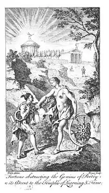 In 1757, he published Poems on Several Occasions, which included an ode entitled Glory, addressed to the Duke of Cumberland, and a heroic poem in two cantos, dedicated to David Garrick, called Paris, or the Force of Beauty. The frontispiece, engraved by Boyce himself, was an allegorical scene depicting "Fortune obstructing the Genius of Poetry in its ascent to the Temples of Learning and Fame".[2]