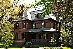 The Rangeley Estate subdivision was a high-end residential development, located southwest of Winchester center on the west side of the railroad tracks. The land was purchased by David Skillings, a lumber businessman from Maine, and developed by him into an exclusive gated development known as Rangeley Park (its wall and pillars that supported a gate are still visible on Church Street, at the northern end of the development). This house was built by Skillings in 1875–76 as a rental property.[2] The house has incorrectly been described as the residence of Samuel J. Elder, one of the founding editors of The Yale Record,[3] the world's oldest humor magazine. This error occurred because the street number of the house is 38, but the number 38 had earlier been associated with a different house in the Rangeley neighborhood where Samuel Elder lived.
