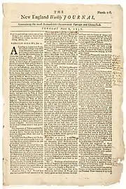After John Boydell, the proprietor of The Boston Gazette died, his heirs sold the paper for a modest sum to Kneeland and Green in 1741.[44] They combined it with their Weekly Journal, and began publication of the Gazette under the new title of The Boston Gazette and Weekly Journal. The Journal was published for twenty-five years until the dissolution of their partnership, in 1752.[45][46]