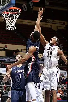 ![]() Samuel Ouedraogo (15) at the NAIA Nationals battling a rebound for LSU- Alexandria (March 18, 2015) | |