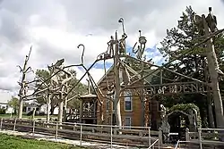 Dinsmoor built and moved into a log cabin on a lot that he named the Garden of Eden in Lucas, Kansas. The cabin is a twelve-room house; the logs are made up of limestone quarried near Wilson Lake. Dinsmoor designed his landscape and spent the rest of his life creating the garden, which contains over 200 concrete sculptures. The sculptures and design of the house reflect Dinsmoor's belief in the Populist movement and his religious convictions, it includes a Labor Crucified figure that is surrounded by the people who put him on the Cross, a doctor, lawyer, preacher and capitalist.[4]