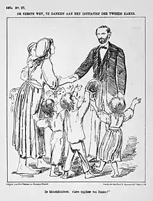 Van Houten adhered to the principle of autonomy regarding the individual as well. On the issue of social policy, he believed government intervention was necessary to eliminate barriers to development of the individual so as to create equality of opportunity and thus to promote individual liberty. In this spirit, Van Houten introduced a bill that forbade child labour for children younger than 12 years. This bill, nicknamed the Kinderwetje van Van Houten, became the first social law of the Netherlands in 1874.[1] Nonetheless, van Houten who started out as very progressive gradually became more conservative and opposed further social laws and any egalitarianism by the state. On individual issues, he continued to sponsor progressive causes, writing about feminism, prostitution and birth control. He was president of a Neo-Malthusian society in 1888.