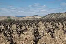 The vineyards of San Asensio. In the distance is a medieval castle.