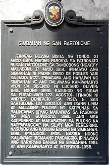 {{cite news}}: CS1 maint: unfit URL (link) - 1 2 Sibug, Joemar (25 May 2014). "San Bartolome Parish de Malabon @400". Davao Catholic Herald. Retrieved 4 April 2015.