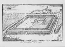 Aerial view of the Lazzaretto with the church of San Carlo in the center