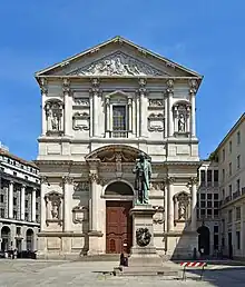 Located in Saint Fedele Square in the centre of the city, near the Palazzo Marino, the Teatro alla Scala and the Galleria Vittorio Emanuele II, the church was commissioned by Charles Borromeo from Pellegrino Tibaldi (1559). Outside of the church, in Piazza San Fedele, is a bronze statue (1883) in memory of the writer Alessandro Manzoni, who lived nearby, and who died from a head injury he received after a fall while exiting mass at San Fedele on 6 January 1873.