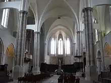 Interior towards apse with gothic tracery.