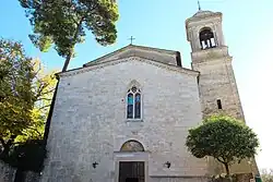 The facade has a 15th-century portal, while the presbytery houses canvases depicting:
