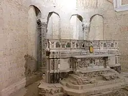 The imposing main altar, damaged over the years, was built in 1743 by Domenico Antonio Vaccaro. Behind the apse is visible the ancient church apse.