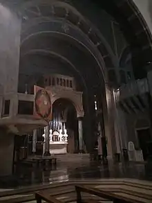 The ciborium was built in Byzantine style by the architect Giovanni Maggi and the sculptor Giannino Castiglioni in 1932. The columns, arches, and facades are made in yellow marble of Mori and Siena, while the columns and background of the superior side are made of onyx. The ciborium is made of four archivolts, which were designed with the reliefs of angels and four zoomorphic creatures. The interior dome of the ciborium is covered in gold leaf. The whole design and painting of the interior dome was made by the painter Giovanni Tonacca.[4]