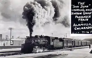 The San Juan Express (also known as simply the San Juan) was a narrow gauge train that ran on the 3 feet (0.91 m) Denver & Rio Grande Western Railroad (D&RGW) route from Durango, Colorado via Chama, New Mexico; Cumbres Pass; and Antonito, Colorado to Alamosa, Colorado. The train ran from February 11, 1937 until January 31, 1951 as train numbers 115 and 116, though towards the end of the passenger service it took on the number 215 and 216.[1]