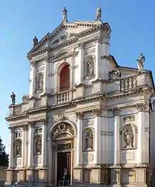 The baroque facade, designed in 1756 by architect Carlo Corbellini, consists of two sets of Corinthian half-columns upon tall pedestals. It hosts 11 statues of saints by sculptors Francesco Uliaco, Francesco Leoni, and Francesco Bartolomei, including side wings with statues at the corners. The triangular tympanum, with thin frames, holds three other statues in the crown. In the lower floor, in the spaces between the half-columns, there are four niches, two on the first floor, with a large niche in the center. The high central window, giving light inside, is walled at the top and was painted in trompe-l'œil.
