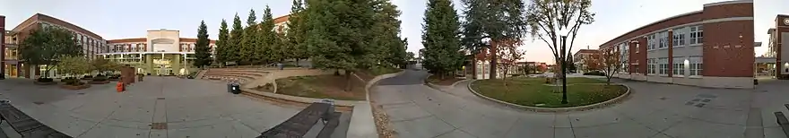 The school moved twice in 1903, and then to Baldwin Avenue in 1911, before moving to its present location on Delaware Street in 1927. In 2001, the school demolished and entirely replaced the original building in an effort to meet modern earthquake safety requirements.[6] Dedicated in August 2005, the new building strongly echoes the design and materials of the original in part due to strong public outcry about the decision to demolish the structure. On February 10, 2006, the campus quad was dedicated to alumnus Merv Griffin, who donated $250,000 to the school ($125,000 of which was intended for the performing arts department).[7] The Merv Griffin Quad sits squarely in the center of the campus and student life at San Mateo High. It includes an amphitheater built in the Greek-style and the Thomas Mohr clock tower, named after a longtime district superintendent and reminiscent of the tower and chimes that were removed from the building during the 1934–1935 structural reinforcements. The courtyard is a popular gathering place for students during lunchtime and rallies.
