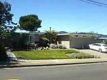 The Highlands was developed as a working-class neighborhood in the mid 1950s. Developer Joseph Eichler, between 1956 and 1964, built most of the homes using a Modernist style now called "California Modern", inspired by Frank Lloyd Wright.[3] The homes are post and beam construction featuring much glass, skylights, and atria. Most have a flat or gently sloped roof and in-floor radiant heating. Many of the neighborhood homes retain their original exterior form and are sought after by enthusiasts of Modern architecture. The neighborhood also includes the experimental X-100, one of only two Eichler houses built using steel rather than timber, as well as Eichlers with additions or other modifications from their original form and homes built by other developers in more traditional styles.
