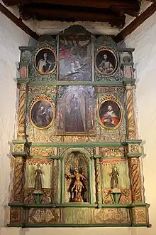 The wooden reredos or altar screen dates to 1798 and is said to be the work of an unnamed artisan known as the "Laguna Santero" who was active in New Mexico between 1796 and 1808. The screen is flanked by large Solomonic columns. A niche in the center of the reredos, with its own small pair of columns, contains a wooden statue of St. Michael the Archangel wielding a sword. The statue originated in Mexico in 1709 and has been in place at least since 1776, when it was mentioned in Domínguez' inventory of the church. Directly above the statue is a large painting of Jesus from the mid-18th century which was found behind the altar screen during the 1955 renovations. At the top center is a 1745 painting of St. Michael attributed to Bernardo de Miera y Pacheco. Around these two paintings are four oval oil paintings on canvas, which are Mexican and date to the early 18th century. Clockwise from top left, they depict St. Teresa of Ávila, St. Gertrude, St. Louis, and St. Francis of Assisi. The entire reredos was painted over at some point but was later restored.[4]