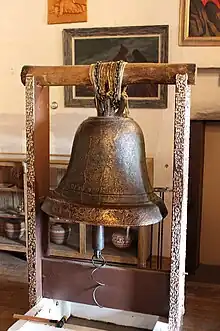 Another notable object associated with the church is the bell that hung in the bell tower prior to 1872, which is still on display inside the building. The bell is mostly copper, weighs 780 pounds (350 kg), and bears the legend