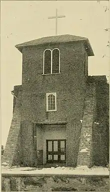 At some point after Domínguez' visit, possibly in the 1830s, the present bell tower was added to the front of the church. By the time of the American occupation in 1846, masses were being held in the church only twice a year. The top levels of the tower collapsed during a storm in 1872[5] and by the 1880s the entire structure was in poor condition. In 1881, the Archdiocese of Santa Fe sold the little-used building to the Christian Brothers who operated the adjacent St. Michael's College. Under their ownership, the church was restored in 1887, rebuilding the bell tower and stabilizing the walls with stone buttresses. This project gave the building a more European appearance, adding arched openings and a pitched metal roof to the front elevation. These elements were later removed in 1955 during the most recent remodeling of the church.[6]
