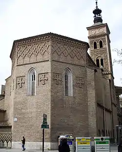 The church and its bell tower are notable examples of Mudéjar architecture. The bell tower has three floors with decorated brickwork, and is surmounted by an 18th-century spire, similar to that of the Torre de la Seo.