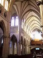 This is a church with a Latin cross, three longitudinal aisles, transept nave and a pentagonal sanctuary. There is no ambulatory. The two gables of the transept house two large rose windows that accentuate the light inside the church. The naves up to the crossing, of which the wider and the highest is the central, are segmented into five rectangular sections covered with four-parts vaults of simple ribbing. The two arms of the transept consist of two sections arched in the same way. The crossing is the only section that features complex ribbing, incorporating tiercerons between the main veins. From the crossing to the head, the naves are extended with three sections. In this posterior space, the four aisles, two on each side, balance the width of the transept, resulting in two separate areas of equal height and divided into six sections separated by four pillars. The slender bell tower, located on the portico of the entrance, is clearly inspired by the spires of the Cologne Cathedral. The set of pilasters and buttresses terminating in pinnacles and spirelets decorated with buds enhance the verticality of the building.