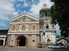 The church has a three-story facade. To its right is a square based three level octagonal bell tower with the statue of San Sebastian, its patron saint on top.[4]