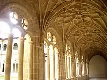 The building was shaped in a transitional style between Gothic and Renaissance style, coming to be known as "Elizabethan" style.[11] While based on a Gothic structure, its upper extension shows Renaissance elements. The cloister, modeled after the layout for Dominican temples implemented in Salamanca's Convent of San Esteban, shows some signature features, the main one being its unusual location right at the beginning of the church nave, due to the proximity of the hill.