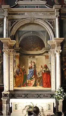 The Benedictine nuns of the Church of San Zaccaria commissioned the San Zaccaria (Saint Zachary) Altarpiece Giovanni Bellini.[1][2] It is Bellini's first work in which the influence of Giorgione is undeniable, starting the last phase in the artist's career, a tonalist one.[3] The Altarpiece has stayed in site (in situ) in the church since it was completed in 1505. The work was mentioned in 1648 by writer and painter Carlo Ridolfi as a large panel commissioned in memory of Venetian politician and diplomat Pietro Cappello; he described it as "one of the most beautiful and delicate by the artist".[4]