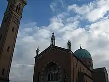 The present Sanctuary was designed under the patronage of Paduan Giovanni Battista Trevisan: his project rebuilt or enlarged the previous construction completed in 1842 in Neoclassical style. It was characterized by the imposing Corinthian portico raised on a high basement and twin bell towers, which flanked the narrow nave. The neo-Gothic sanctuary was designed (1890) by Eugenio Maestri as an extension of the previous building. The interior was completely painted in tempera by Giacomo Manzoni in collaboration with Agis Aschieri. Construction lasted till 1931 with the aid of Nino Gallimberti and Agostino Zanovello.[1]