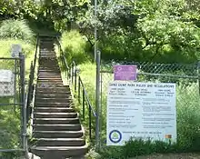 Next to the dune is an un-restricted set of 208 steps that look like an attractive alternative, though there are signs that read "No Jogging." Fines are higher for jogging on the steps. The city regularly sends police to watch for violators. When questioned, enforcement officials seem to distinguish between jogging and walking, the rules sound very close to those of International Racewalking, requiring one foot to be on the ground at all times.[6]