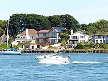 Sandbanks is connected to Studland by the Sandbanks Ferry, a chain ferry across the mouth of the harbour. The Sandbanks area of Poole Harbour (known as North Haven Lake) is used for water sports and by light marina craft. The north side is home to the Southern Headquarters of the Royal Yachting Association and a sailing school.[3]