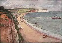 Sandown Bay is an excellent example of a concordant coastline and has well-developed sandy beaches stretching all the way from Shanklin to Culver Down due to Longshore drift.[6] The bay has over 5 miles of unbroken sandy beach, making it one of the longest beaches in the British Isles.[7] The area has weak sandstone cliffs which vary from 30 to 130 feet (10 to 40 m), these have suffered from erosion and instability in the past. The risk of cliff-failures affecting populated tourist areas led the Isle of Wight Council to commission a report and an extensive structural stabilisation programme in 1988.[8]