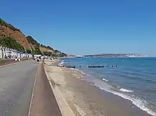 Sandown Bay is a broad open bay which stretches for much of the length of the Isle of Wight's southeastern coast. It extends 8+12 miles (13.7 km) from Culver Down, near Yaverland in the northeast of the Island, to just south of Shanklin, near the village of Luccombe in the southwest.[1] At Luccombe, the bay is separated from The Undercliff by a large headland from which Upper Ventnor sits atop. The towns of Shanklin, Lake and Sandown are on the bay's coast, while Luccombe and Upper Ventnor feature panoramic views across both Sandown Bay to the East and the Undercliff to the southwest. Due to the bay being relatively sheltered from offshore winds it is often used as temporary anchorage point for boats,[2] including large cargo ships, before continuing east towards Continental Europe, or north towards The Solent.