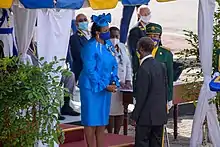 On 12 October 2021, Mason was nominated by Prime Minister Mia Mottley and Opposition Leader Joseph Atherley to become the first President of Barbados.[18] On 20 October she was elected by both houses without opposition, although no national vote amongst the people was ever held.[19] Mason took office on 30 November 2021,[20][21] the 55th anniversary of Independence. While she is nominally chief executive and is the sole head of state in Barbados, in practice her role is mostly ceremonial, much like her previous role as Governor-General.[22] She made her first official visit to Kenya in June 2022.[23]