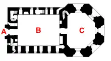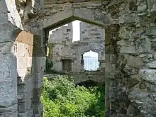Sandsfoot Castle was built from Portland stone with ashlar facings and a rubble core.[47] It comprised a main blockhouse attached to an octagonal gun room, overlooking the sea.[48] The two-storey blockhouse is 42 by 32 feet (12.8 by 9.8 m) across, with a gate-tower on its landward side.[48] It probably originally had four rooms for the accommodation and cooking facilities for the garrison, with staircases leading up to the first floor and down into its basement.[49] The gate-tower held a small room on the first floor and was designed to hold a portcullis.[49] The one-storey gun room was approximately 36 by 28 feet (11.0 by 8.5 m) across with five embrasures for guns and a flat roof that also probably supported artillery. Both the gun room and the main block were probably protected by parapets.[49]