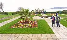 The castle originally had an outer ward, reached over a bridge, and stables, although these have been both been lost.[49] Protective rectangular earthworks were constructed to protect the castle on the landward side, probably in 1623, with two bastions in the north and west corners, and some form of stone structure along the earthworks.[48] In the 18th century these earthworks were described as forming a "deep trench" and mid-19th century accounts suggested that they were around 12 feet (3.7 m) deep.[51] Now only 100 feet (30 m) of the bank and ditch survives, with the earthworks approximately 10 metres (33 ft) wide overall and 2.2 metres (7 ft 3 in) deep between the top of the bank and the base of the ditch.[48] The north bastion still survives largely intact, although the west has been mostly destroyed.[49] Outside the entrance to the earthworks are the Sandsfoot Gardens, civic gardens dating from 1951, designed in a Tudor style with an ornamental pond.[52]