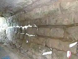 The base and lower half of the culvert is constructed of poor quality grayish sandstone to a height of approximately 1 metre (3 ft 3 in). These sandstone blocks are heavily weathered as a result of water erosion. The curved roof is made of fired red bricks built in two overlapping layers. Both the sandstone and upper brick structures feature lime mortar, which is in poor condition and is crumbling.[1]