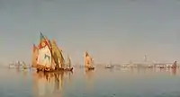 Thirty-six Venice paintings, based on his 1869 drawings and studies of the city, were listed in the 1881 memorial catalogue of Gifford's works. He painted additional Venetian works, according to biographer Ila Weiss. In 1875, he wrote to a friend: "I have painted so many Venetian pictures during the last five years that I have lately declined to paint them when they have been asked for. One can't stay in Venice forever any more than one can eat partridge every day."[9] In the same letter, he wrote about his commission fees: "The price of such a picture the size of the [Fishing Boats Entering the Harbor of] Brindisi is $1600 without the frame. That is the price I received for the Brindisi, [Lake] Geneva, and [Mount] Renier [sic] [- Bay of Tacoma].[9]