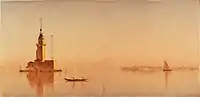 Mr. S. R. Gifford was represented [at the 1876 Centennial Exposition] by his Sunrise on the Sea-Shore, of which it may be said that the sea and its solitude has seldom inspired a more profound motive, or one more adequately rendered, than this picture. Tivoli and Lake Geneva are no less admirable, but with a very distinct sentiment, and Pallanza, Lago Maggiore has a full-blooded sense of light, modified by tone that is in every respect masterly in treatment. Two pictures by the same artist, Fishing-Boats of the Adriatic and San Giorgio, Venice, are as strong and pronounced in color as the former works are delicate and suggestive. The artist is varied in his powers, and sustained, free, and finished in his methods. His pictures always manifest great elevation of thought and feeling. They are the interpretation of the profound sentiments of Nature rather than of her superficial aspects.[14]